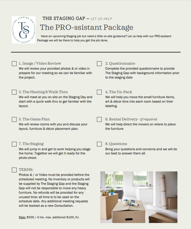 Ever wish you could do a quick review of your Staging Plan to make sure you are on the right track? This has been a very popular package for New Home Stagers, we can guide you through the process, give you specific direction and even give you some ideas on what inventory items you might need to add and were to get them!